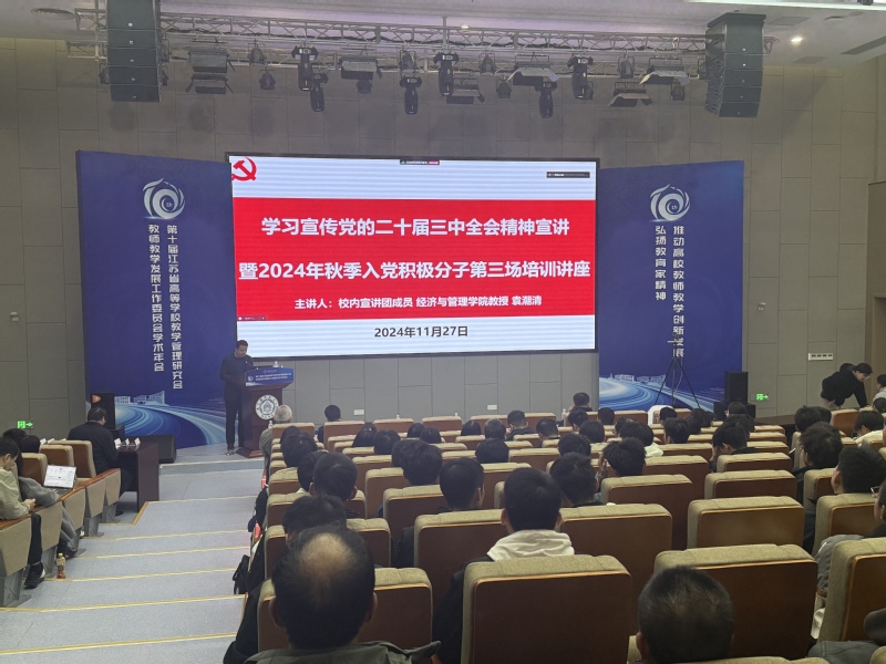 11月27日,金沙集团1862cc成色举行学习宣传党的二十届三中全会精神宣讲暨2024年秋季入党积极分子第三场培训讲座。学院全体领导班子、教职工党员、学生党员及入党积极分子参加讲座。讲座由学院党委书记高健主持。